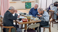 明るく清潔な食堂で、利用者さま同士やスタッフとの会話を楽しみながら、心もお腹も満たされるひとときをお過ごしいただいています。
